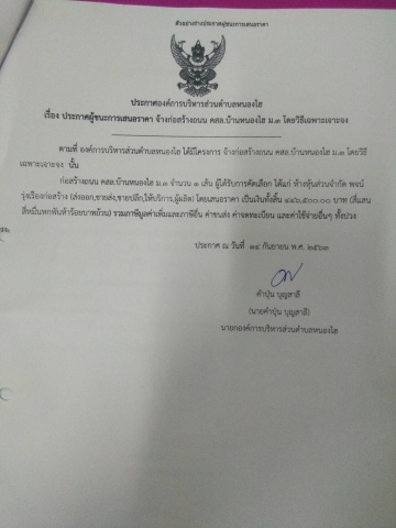ประกาศผลผู้ชนะก่อสร้างถนนคสล.บ้านน้ำเกลี้ยงหมู่ 3