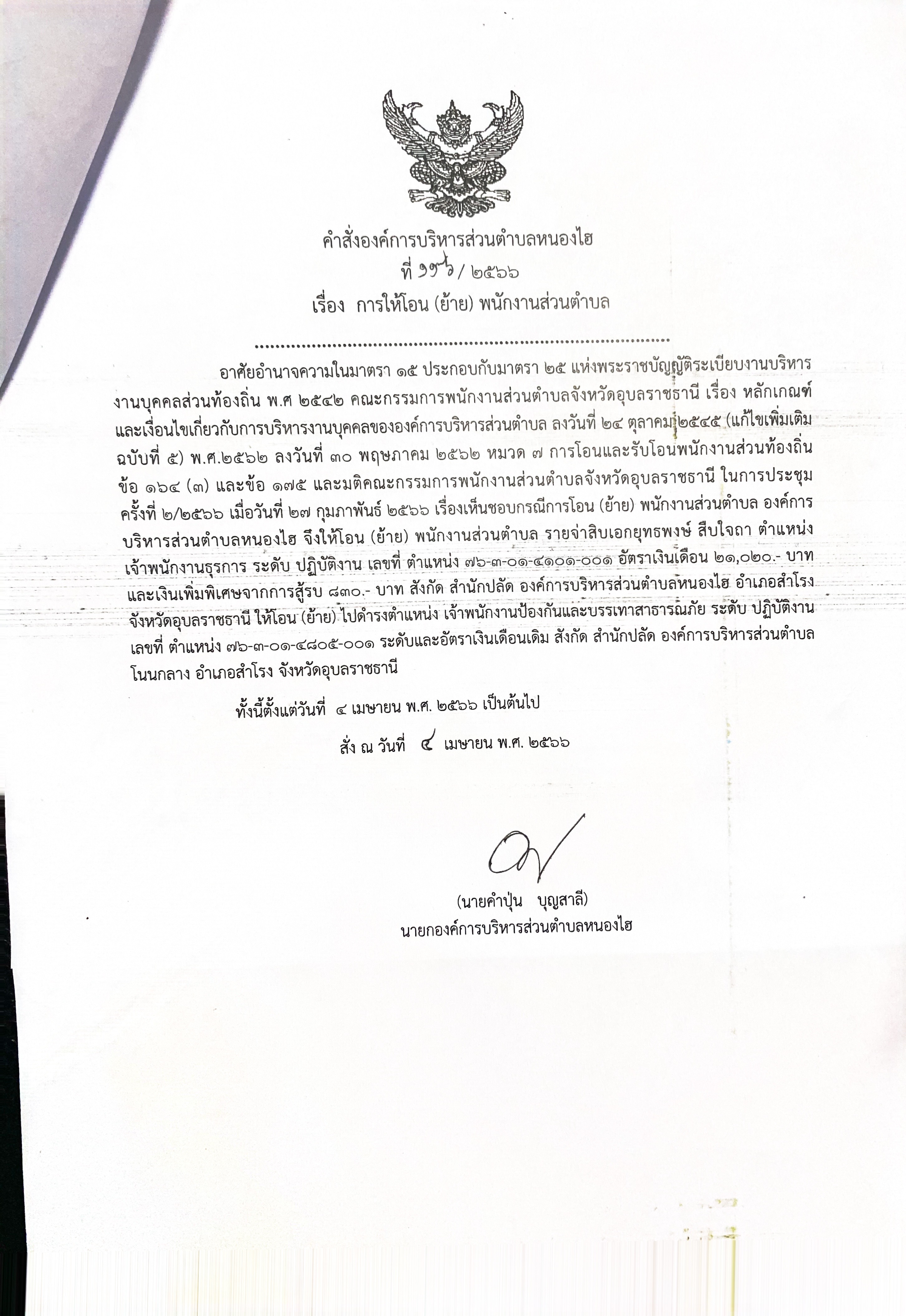 การให้โอน(ย้าย)พนักงานส่วนตำบลองค์การบริหารส่วนตำบลหนองไฮ
