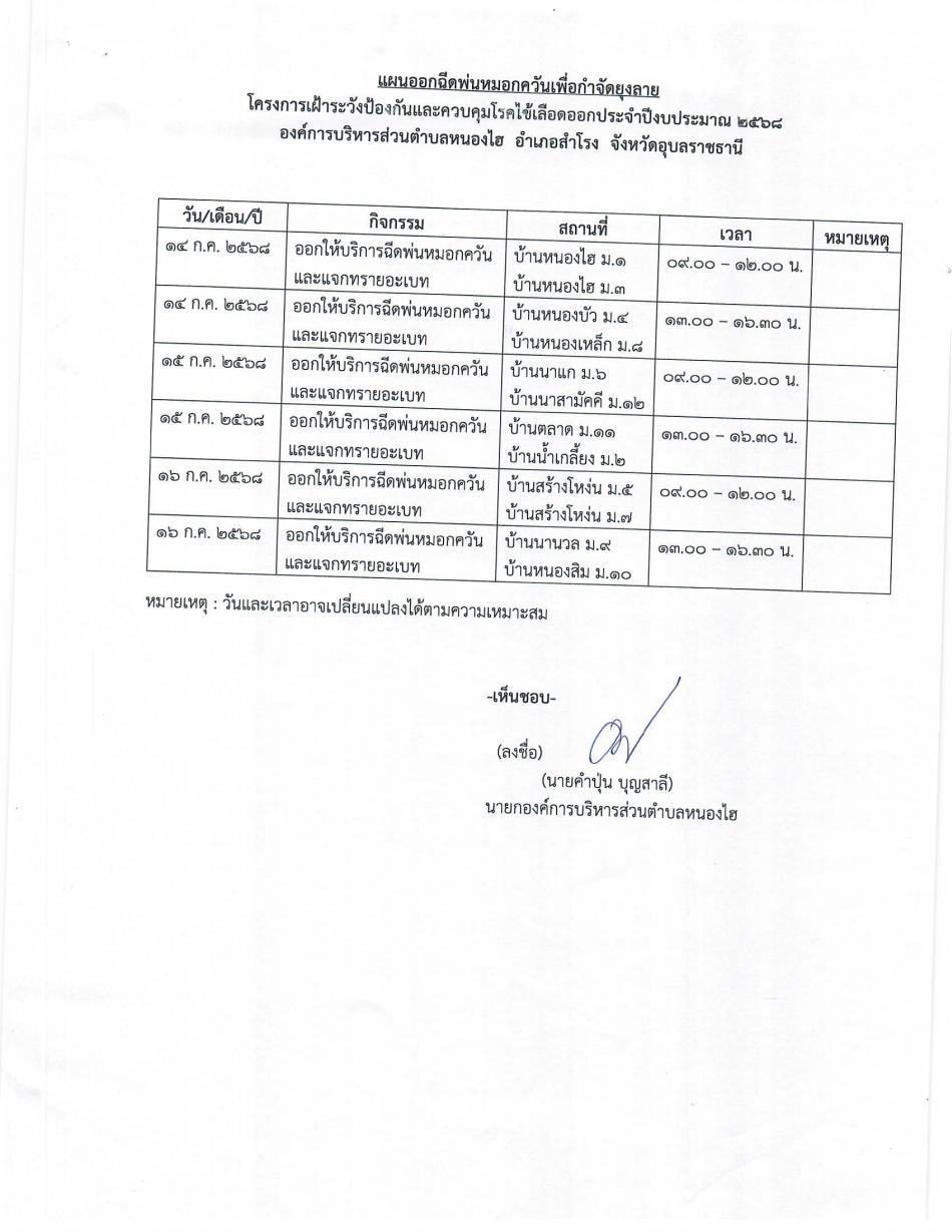 ประชาสัมพันธ์แผนออกฉีดพ่นยุงตามโครงการเฝ้าระวังป้องกันและระงับการแพร่ระบาดของโรคไข้เลือดออก ประจำปี พ.ศ. 2568 [8 กรกฎาคม 2568]