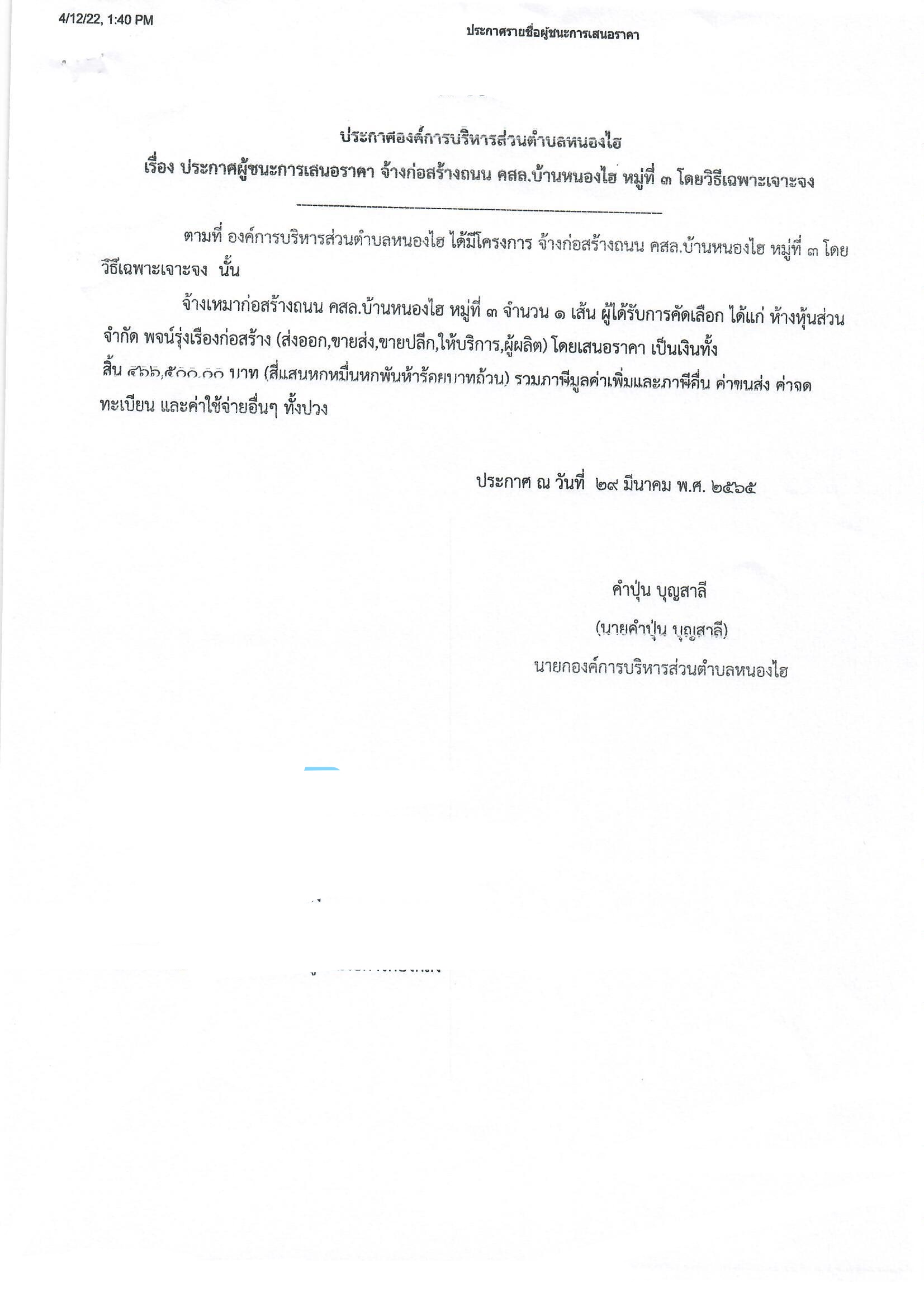 เรื่องประกาศผู้ชนะการเสนอราคา ก่อสร้างถนนคอนกรีตเสริมเหล็ก บ้านหนองไฮ หมู่ที่ 3 โดยวิธีเฉพาะเจาะจง