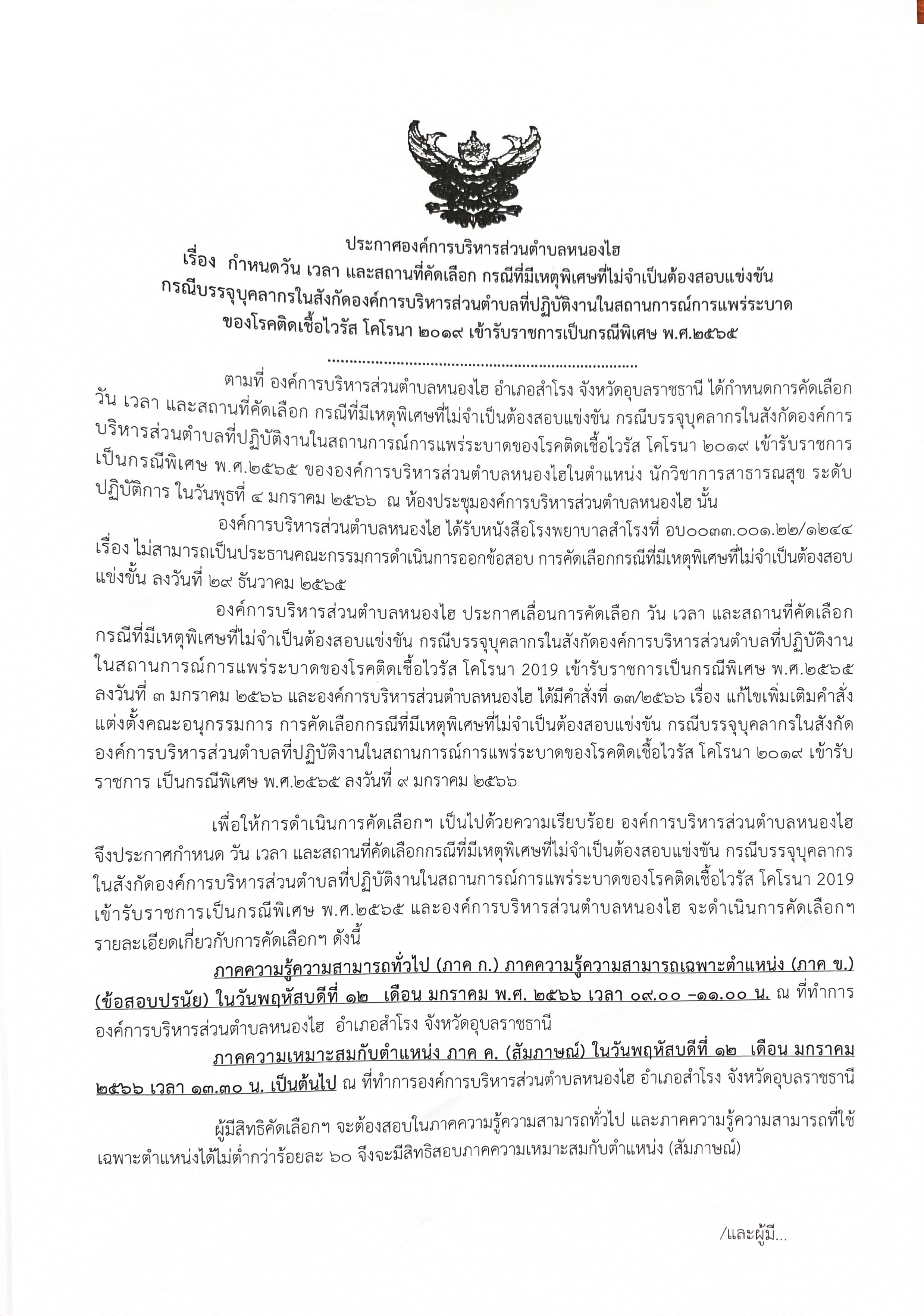 ประกาศเรื่องกำหนดวัน เวลา และสถานที่คัดเลือก กรณีมีเหตุพิเศษที่ไม่จำเป็นต้องสอบแข่งขัน