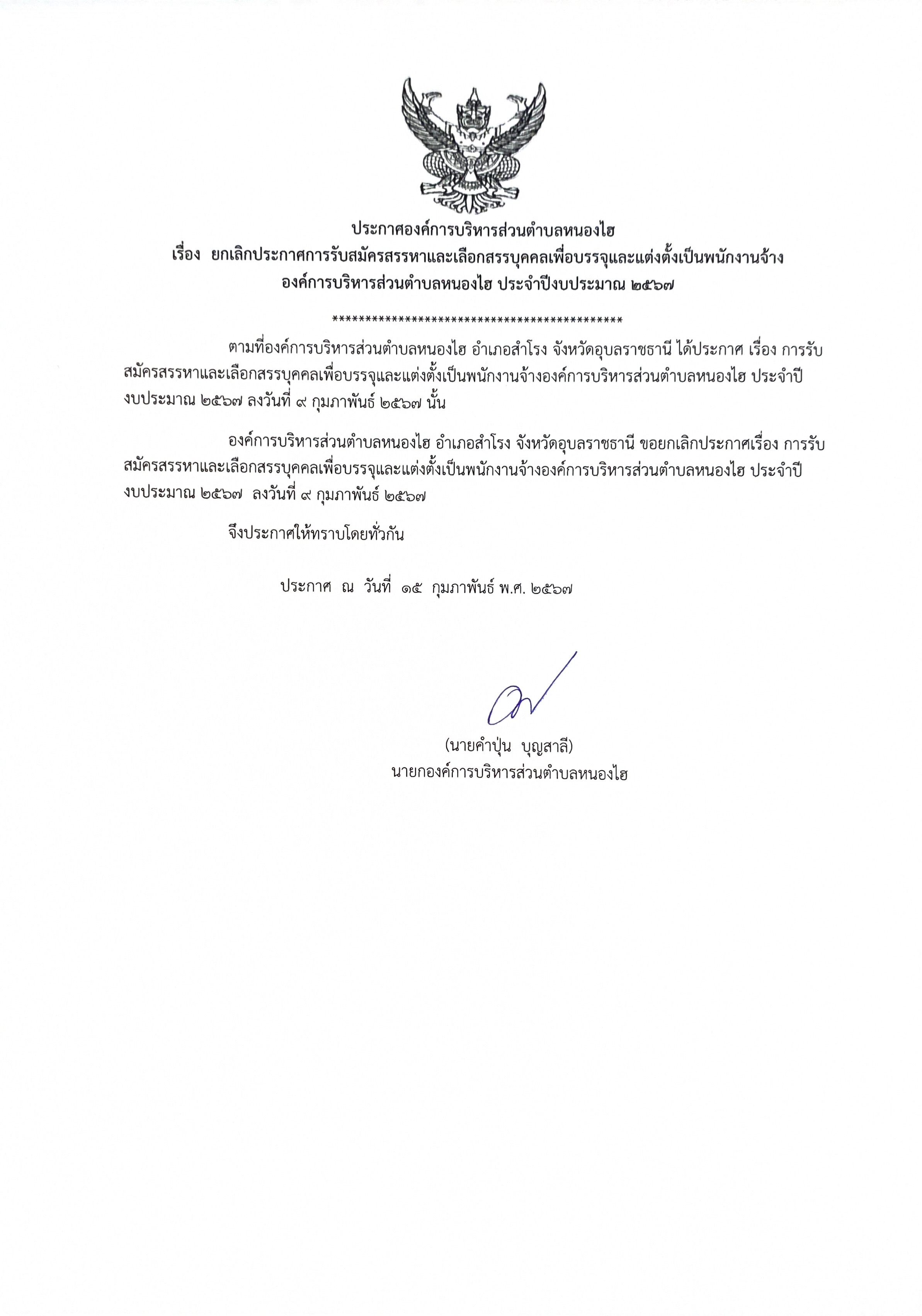 ชื่อเรื่อง : ประกาศองค์การบริหารส่วนตำบล เรื่อง ยกเลิกประกาศการรับสมัครสรรหาและเลือกสรรบุคคลเพื่อบรรจุและแต่งตั้งเป็นพนักงานจ้าง องค์การบริหารส่วนตำบลหนองไฮ ประจำปีงบประมาณ 2567